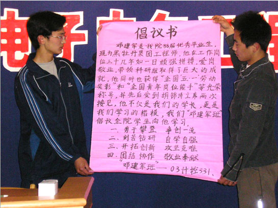 我系邓建军班――03计控331班的班长陈俊代表全班员工向我系全体员工发出倡议,04自动631班随即给予响应,其它各班班长亦纷纷代表本班员工踊跃上前在倡议书上签上班名,气氛异常活跃。获奖员工代表肖开和李敏分别作了精彩发言,表示将以邓建军为榜样,努力拼搏、刻苦钻研,扎扎实实打好专业基础,将来更好地为企业服务,为社会服务,为轻院争光。