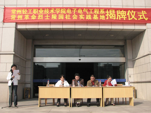 首先进行的是实践基地揭牌仪式。在热烈的掌声中,电子系黄主任与陵园陈主任共同掀开了铜牌上的红布,此举意味着我系首个老员工社会实践基地正式成立!首个社会实践基地的建立,是我系员工社会实践工作的一座里程碑,也是我系和常州革命烈士陵园合作的一座里程碑。它为我系同学搭建了一个立足社会、服务社会的平台,同时也意味着双方会在更宽领域、更深层次进行合作,从而能更有效地开展老员工社会实践工作。