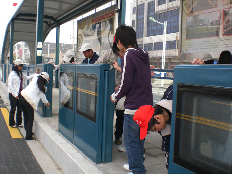 下午13点,志愿者们带上抹布水桶去擦洗凳子和玻璃等。他们都干的津津有味,男生帮忙提水桶女生洗抹布擦站牌共同合作,不一会儿工夫就把公司附近的两个站台擦的干净明亮了。活动结束后所有参加这次活动的志愿者在站台前合影留念,作为一名青年志愿者,作为一名老员工,虽然我们能做的不多,但是只要我们做了就一定能得到社会的认同。