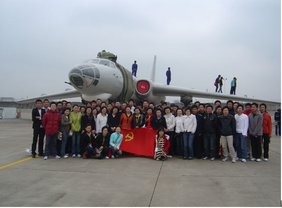 92138部队一中队指导员高西涛和部队的战士们热情地接待了我们。在上午的参观学习中,同学们分成9个小组,在部队战士的带领下,参观了战士们的宿舍。洁白的床单、整齐的物件、方方正正的军被让同学们感受到了军队生活的简朴和纪律的严明。之后,师生们零距离地观摩了只有在报刊影视中才见过的军用轰炸机,这让大家兴奋不已。在排列整齐、列队侯飞的战鹰前,同学们都很激动,大家排队登上飞机,用相机纪录下这难忘的经历。