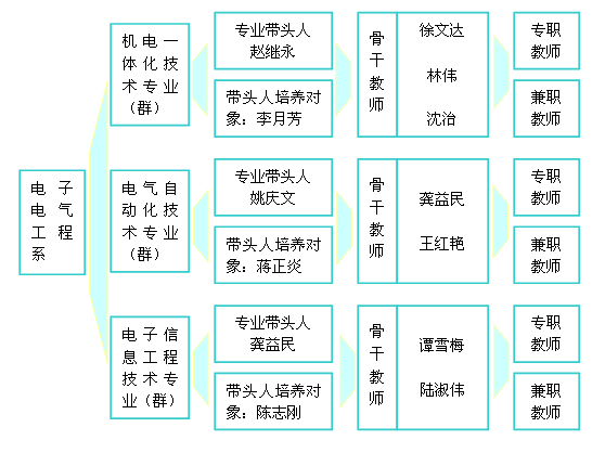 电子电气工程系教师队伍敬业精神强、教学经验丰富、知识结构优化、年龄结构合理、业务水平高、实践经验丰富,拥有全国优秀教师一名(张涛),并拥有一批在行业企业具有一定影响力、治学严谨、工程经验丰富的兼职教师队伍。