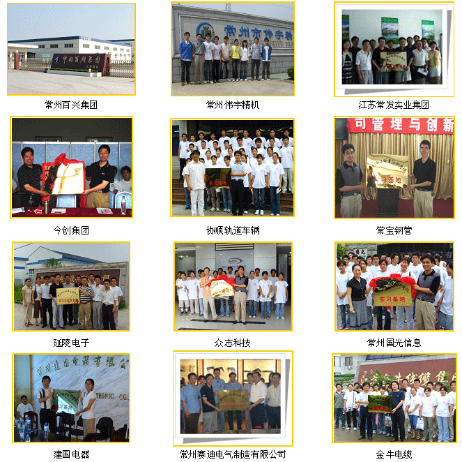 近年来,公司先后与江苏常发集团、江苏新瑞机械有限公司、美国UGS公司、武汉华中数控股份有限公司、大连机床集团、SIEMENS(西门子)、CAXA北方数码大方有限公司、北京斐克科技有限公司、梅特勒-托利多电子衡器有限公司等企业建立了紧密的校企合作关系,还与戚墅堰机车车辆工业研究所、江苏常发集团、今创集团、江苏新科电子集团、江苏新瑞机械有限公司、常州赛迪电器制造有限公司、常州超远汽车零部件制造有限公司、常州华威亚克模具制造有限公司、常州慧阳科技发展有限公司等40家企业建立了校外实习基地。
