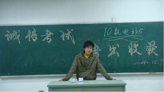 由于临近考试,此次团课主题为“诚信考试 考出收获”。古人云:“车无辕而不行,人无信则不立”在竞争日益激烈的今天,诚信二字显得尤为重要。然而在“金钱至上”的社会熏陶下,不诚信的现象渐渐渗入校园之中。因此我们认为树立诚信,刻不容缓。诚信考试就是通过考试来捍卫诚信,大家对诚信也都慷慨陈词,表达出自己对诚信的坚定信仰和永不背离诚信的决心!最后,10机电335全体成员紧握右拳、庄严宣誓:我们坚守诚信,我们绝不作弊!!!