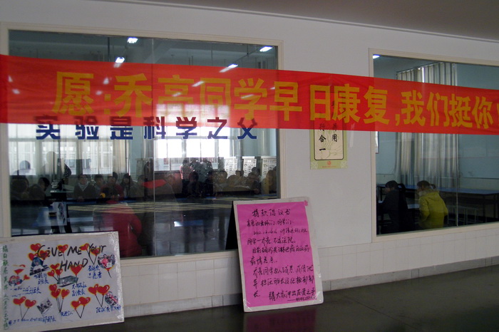 “一方有难,八方支援”。09信息331班同学得知消息后,班内立即组织募捐,第一批捐款8840元已于元旦前送到乔亮父母手中。随后电子系分工会送来了电子系教师的爱心捐款,1月12号下午两点,电子系团委在工训楼309-9举办了“点‘亮’希望,留住生命”的募捐仪式,电子系的同学们回忆着和乔亮同学相处的点滴,为乔亮默默祈祷,此次募捐仪式共募集爱心捐款52753.65元。乔亮同学的不幸遭遇,也引起了院领导和全校师生的广泛关注,大家纷纷投入到爱心接力活动中来。公司党委张涛副书记十分关心此事,不但批复爱心基金资助5000元,自己还当场捐款400元。还有其他的领导、老师和同学在院内公共捐款箱奉献了爱心但不肯留下自己的姓名,兄弟系部团委也纷纷送来爱心捐款。截至12日晚,电子系团委共募得捐款90760.85元(含第一批送去的8840元)。目前乔亮同学正在积极治疗之中,公司、系部领导拟定于1月23日前往医院看望乔亮同学。