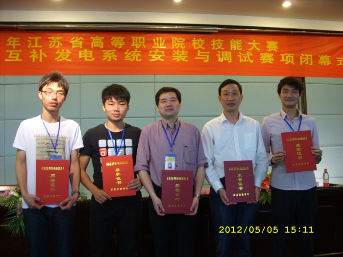 电子系由姚庆文、韩迎辉老师指导的徐祥、周立超、刘传亨在江苏省“风光互补发电系统安装与调试”项目中得第三名,荣获二等奖。我系的本赛项将代表江苏参加全国职业技能竞赛,目前正紧张训练,准备六月底的国赛。