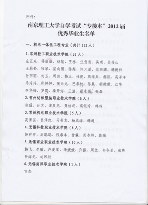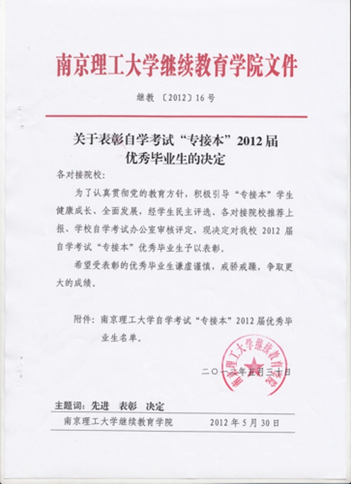 关于表彰自学考试“专接本”2012届优秀毕业生的决定
