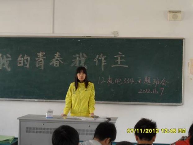 班会上,副班孟雅琴以高昂的热情的开场:青春是纷纷扬扬的花瓣,花开时,芳香迷人;凋零后,只会是一地的支离破碎。同学们请珍惜青春吧!精辟的比喻,勾画出了青春大致的模样,深深触动了12机电334班每一位同学的心,引发了大家对自己走过的青春的回顾,和持续的青春思考。随后,上来的几位同学代表,发表了各自对青春的理解,出入大学的同学们,还略显得青涩,朴实无华的语言,仍有些拘谨。可是从话语间闪现出来的都是生活的味道,他们谈着自己的经历,有着对逝去青春的悔恨,更多的是对未来青春的美好憧憬!主题班会上的同学们踊跃发言,争先表达了对青春的看法,互相交流意见,班级气氛融洽,同学之间的了解和沟通也得到进一步加强。