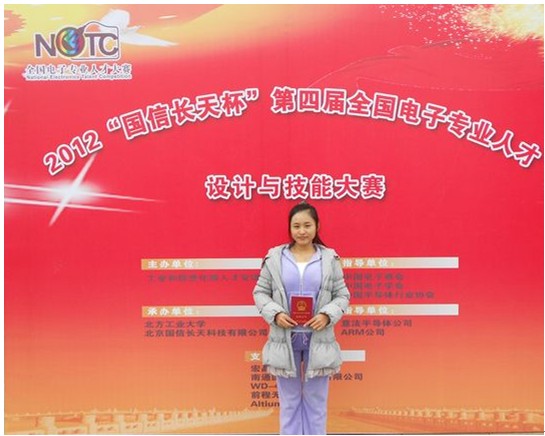 Ø 2012年“国信长天杯”全国电子专业人才设计与技能大赛,张丽丽荣获(大学组)一等奖。