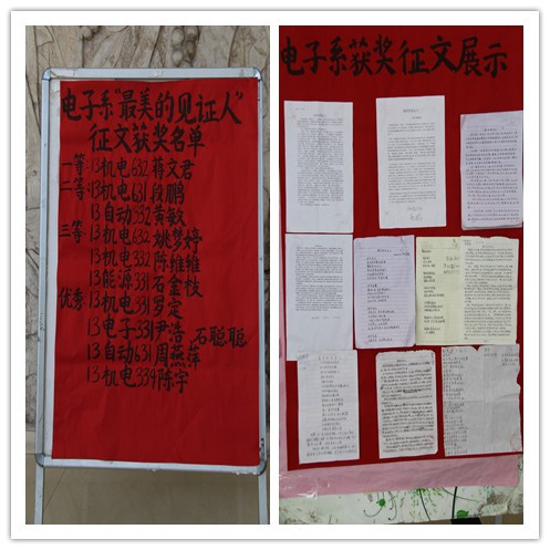 征文活动分为作品征集、作品评选和优秀作品展出三个阶段。10月7日,系部确定了以“最美的见证人”为本次征文活动主题。7日至11日,进行了作品征集,从大一每个班级选取3篇作品。接着进行作品评选,由辅导员老师和学习部的员工组成评委组给参赛作品打分,最后选出了了一等奖1名、二等奖2名、三等奖3名、优秀奖4名。14日,在工训楼、2号公寓和10号公寓对优秀作品进行了展示。