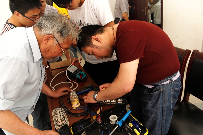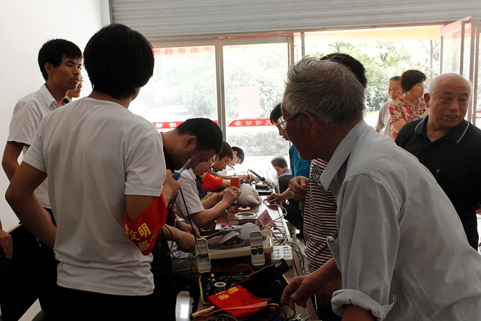 就在志愿者们刚刚下车,便有很多社区居民等候多时,带着电饭锅、收音机、电风扇、台灯等20余件故障电器前来。工作量虽然大但是老师同学们一件都不敢怠慢,大家手不停歇忙的不亦乐乎!看着一件又一件故障电器被修好,社区居民赞不绝口。同时流光映纪拍客俱乐部的志愿者拿起相机为居民拍摄照片,并记录活动的各各瞬间。志愿者良好的服务态度和出色的专业技能得到了社区居民的肯定和赞扬,社区居民十分希望有机会再搞这样有意义的活动。