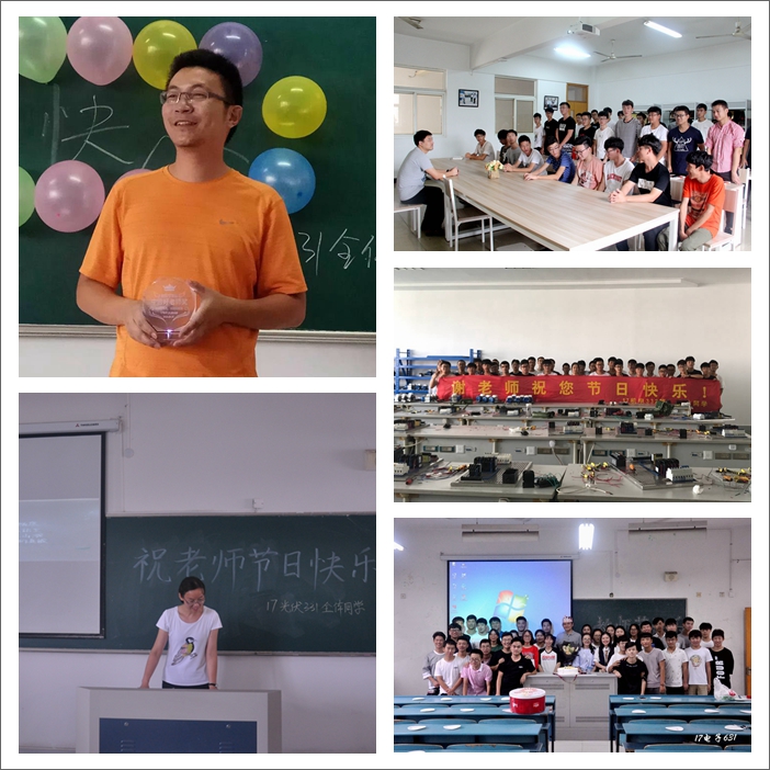为了能够带给班主任一个惊喜,同学们早在暑假期间就开始头脑风暴策划活动,一开学立马进行排练和拍摄,祝福的话语汇聚在一个个视频中,只为了给辛苦工作一年的班主任们送上一份最真挚的心意。17自动331、17自动332、17自动631三个班拥有同一位班主任张书贵老师,他们邀请班主任来到教室与同学们一起观看祝福视频,随后现场同学们一同起立向班主任鞠躬致谢,感谢他一年的操劳与付出。17电子331的同学提前布置教室,将彩色的气球贴在黑板上,并向班主任丁华锋送上了特别定制的“中国好老师奖”……当班主任们看到同学们精心拍摄的祝福视频时,欣慰快乐的笑容漾上脸庞,这是对他们默默耕耘付出的最动人肯定。