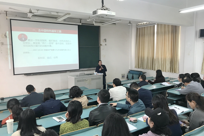 为深入学习贯彻习近平新时代中国特色社会主义思想和党的十九大精神,全面理解把握新时代新要求新挑战,11月14日,材料工程与技术公司和球盟会共同开展“党的十九大精神”宣讲,内容为《走中国特色强军之路,推进国家统一,构建人类命运共同体》。本次宣讲由马克思主义公司张永林老师主讲,材料公司、电气公司全体教师参加了宣讲。