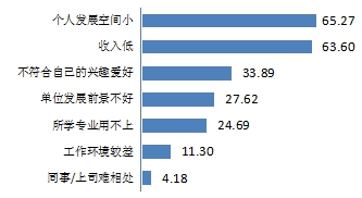 总体工作满意度:2018届毕业生对目前工作的满意度处于较高水平,为83.22%;可见毕业生对初入职场的工作岗位、工作内容及职业发展前景等方面均比较认同。进一步调查毕业生对目前工作不满意的原因:其中,最主要原因是“个人发展空间小”(65.27%),其次是“收入低”(63.60%)、“不符合自己的兴趣爱好”(33.89%)等。