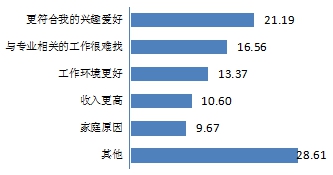 总体专业相关度:2018届毕业生目前就职岗位与所学专业的相关度为47.02%;可见大部分毕业生所学专业及技能与实际工作的契合度较高,能够学以致用。进一步调查毕业生从事与专业不相关工作的原因:其中,最主要原因是“更符合我的兴趣爱好”(21.19%),其次是“与专业相关的工作很难找”(16.56%)。