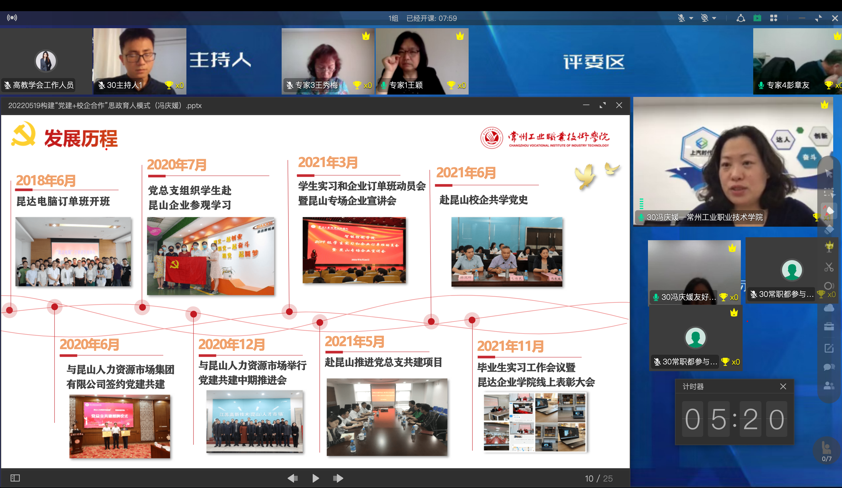 当天线上走访活动在上汽时代动力电池系统有限公司举行,该企业是继昆山人力资源市场之后,又一家与公司党总支合作“党建+校企合作”思政育人模式的企业。冯庆媛首先代表项目团队分别从项目基本情况、项目实施内容、应用成效及典型示范效应四方面进行案例汇报。公司党总支坚持贯彻“加强党的领导是做好教育工作的根本保证”,按照“合作共赢、匠心育人、服务区域”原则,不断深化对产教融合、校企合作的认识,在与昆达电脑科技公司(昆山)有限公司数年合作订单班基础上,逐步形成“弘扬工匠精神、汇聚红色力量、引领特色发展”理念,以2020年与昆山人力资源市场集团党总支结对共建为契机,创新探索出“党建+校企合作”育人新模式。该模式以党建引领弘扬工匠精神为主线,通过开展校企党团活动、成立企业公司、共建“校企工匠大讲堂”和工匠工作室、引入“党建导师制”、打造“红领示范岗”等举措,探索整体设计、联合培养、定向就业的人才培养模式,实现双方成果互通互享,从而不断将党的政治优势、思想优势、组织优势转化为“培养更多高素质技术技能人才、大国工匠、能工巧匠”的内在驱动。