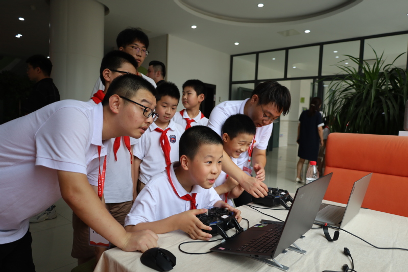 球盟会的师生联手为现场的同学们带去了精彩的无人机和机器人科技秀。“哇,是无人机!它居然会在天上翻跟斗”“这个机器人跳舞真厉害啊”……亲眼目睹无人机穿越障碍、花式飞行,机器人左右摇摆、全场热舞,现场小员工们的欢呼声和掌声络绎不绝,将本次活动的气氛推向了高潮。科技秀结束后,球盟会的专业老师和工匠团支部的员工们带着小朋友们一起操控无人机、机械臂、机器人等科技设备,开展职业启蒙和研学体验。小员工们近距离地感受到科技的魅力,点亮科技梦想,对未来的职业发展充满希望。