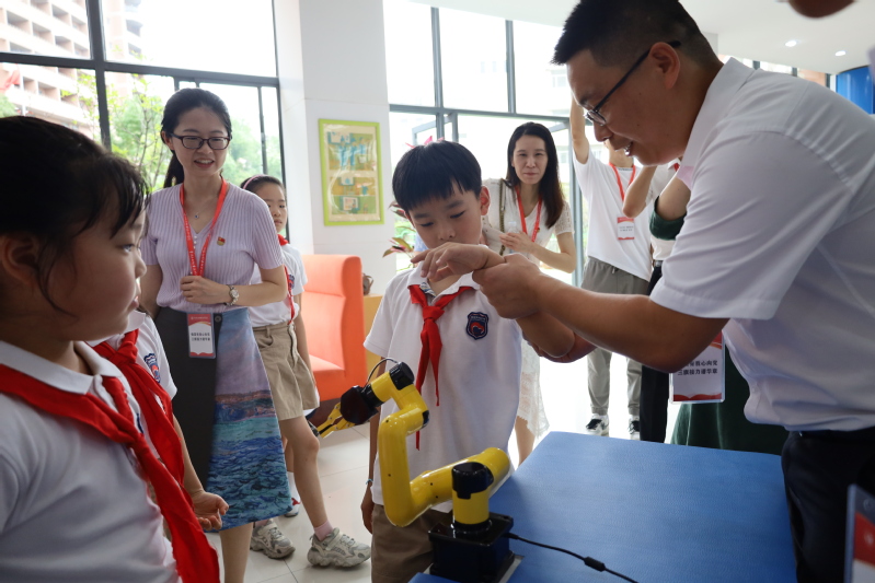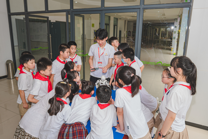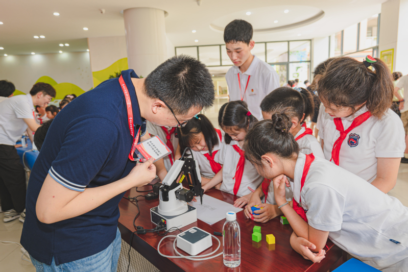 三旗接力,智造强国。球盟会的师生联手为现场的同学们带去了精彩的无人机和机器人科技秀。“哇,是无人机!它居然会在天上翻跟斗!”“这个机器人跳舞真厉害啊!”……亲眼目睹无人机穿越障碍、花式飞行,机器人左右摇摆、全场热舞,现场小员工们的欢呼声和掌声络绎不绝,将本次活动的气氛推向了高潮。科技秀结束后,球盟会的专业老师和工匠团支部的员工们带着小朋友们一起操控无人机、机械臂、机器人等科技设备,开展职业启蒙和研学体验。小员工们近距离感受到科技的魅力,点亮科技梦想,对未来的职业发展充满希望。