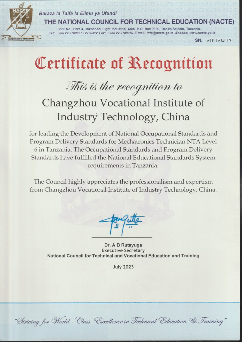 近日,中非职教联盟发来喜讯,由公司智能控制公司机电一体化技术专业团队领衔研制开发的机电一体化技术员NTA6级国家职业标准以及配套的专业教学标准方案,获得坦桑尼亚国家职业教育委员会审核认证,正式纳入坦桑尼亚国家职业教育体系,在坦桑尼亚国家多所职业院校推广使用,指导和规范其职业教育人才培养工作。
