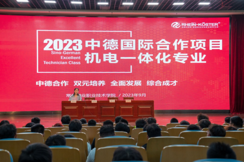 莱茵科斯特常州分公司副总高丽在公司图文报告厅为23级机电一体化技术专业的新生作动员宣讲,详细介绍了中德国际合作项目相关情况。