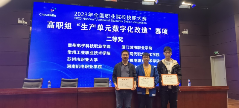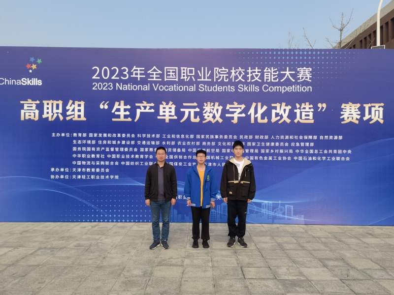 2023年10月13日,全国职业院校技能大赛“生产单元数字化改造”赛项在天津轻工职业技术公司落下帷幕,来自全国各省、自治区、直辖市82支代表队参赛。由球盟会教师陈华奎,22工业机器人631班成诚、金嘉诚组成的师生同赛团队,以优异成绩获得该赛项的二等奖。