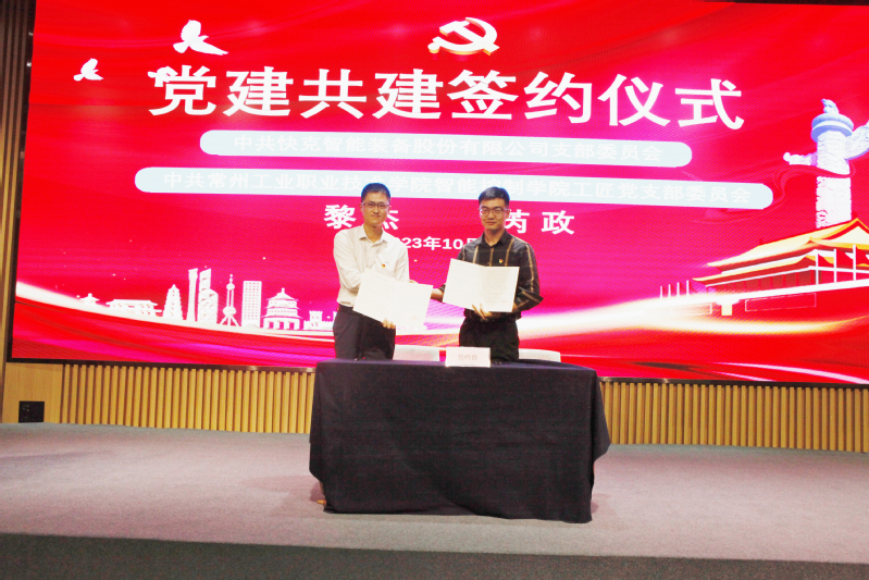 随后球盟会刘进福副经理和快克智能产教事业部总监沈朋进行了现场工程师项目的校企合作签约仪式。球盟会工匠党支部书记芮政和快克智能党支部书记黎杰同时也签署了校企党建共建协议。