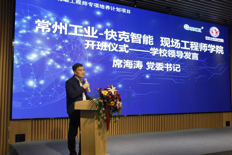 席海涛书记感谢快克智能装备股份有限公司为公司的人才培养和校企合作所做的工作,肯定了企业作为全国专精特新和制造业单项冠军企业所取得的成绩,希望校企在现场工程师项目中能够通携手并肩、深化合作,充分发挥项目的示范引领作用,合力解决“卡脖子”问题,为高端装备实现高水平科技自立自强贡献力量。希望同学们充分认识到国家举行现场工程师班的背景和意义,勤奋学习,勇于攻坚,苦练技术、技能,追求精益求精。