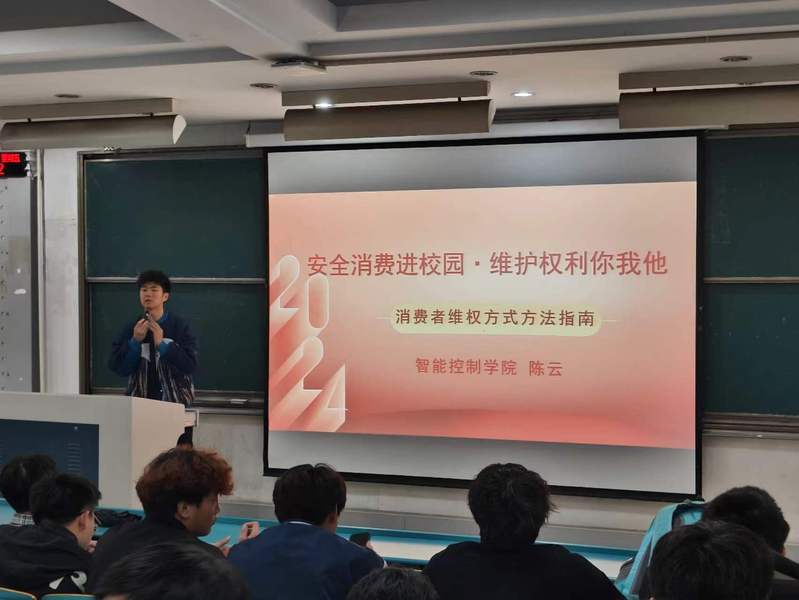“同学们,你们有没有经历过买东西买到假货?去餐厅吃饭导致腹泻,食物中毒?出去旅游被收取不合理的费用?……”活动开始,陈云抛出一系列问题,迅速引起同学们的广泛讨论。随后他从消费者权益日介绍、如何维权、实用投诉电话三个方面展开交流讨论,在一问一答中,同学们无形之中“点亮消费维权技能”。