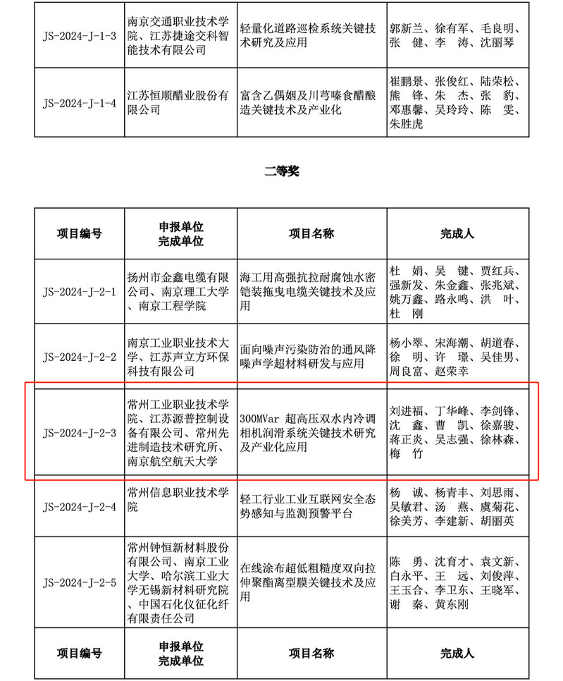 由qm球盟会、江苏源普公职设备有限公司、常州先进制造技术研究所、南京航空航天大学联合申报完成,公司刘进福、丁华峰、李剑锋、蒋正炎等人主要完成的《300MVar超高压双水内冷调相机润滑系统关键技术研究及产业化应用》获技术进步奖二等奖;由qm球盟会、中科摩通(常州)智能制造股份有限公司、常州先进制造技术研究所联合申报完成,公司王可、刘进福、李剑锋、于松、施琴、沈建明等人主要完成的《JC-WL221008新能源汽车热管理系统智能成套装备技术及产业化》获技术进步奖三等奖。