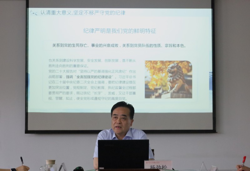 杨劲松从“认清重大意义,坚定不移严守党的纪律”“加强党性修养,切实掌握党的纪律内容”“坚持自省自励,自觉筑牢违规违纪底线”三大方面展开论述。