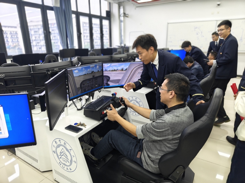 会后,球盟会一行参观了南航天目湖校区及飞行技术专业实验室,进行模拟飞行体验。