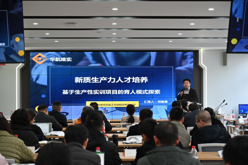 北京华航唯实机器人科技股份有限公司技术总监何智勇作《新质生产力人才培养——基于生产性实训项目的育人模式探索》主题报告。从发展新质生产力、生产性实训项目开发、“十个一”成果导向三大方面展开介绍,强调了如何建立产教融合生态系统赋能新质生产力产业链,以大量的案例生动阐释如何开展实训项目开发,诠释如何开展新质生产力人才培养,并展示了相关重大成果。