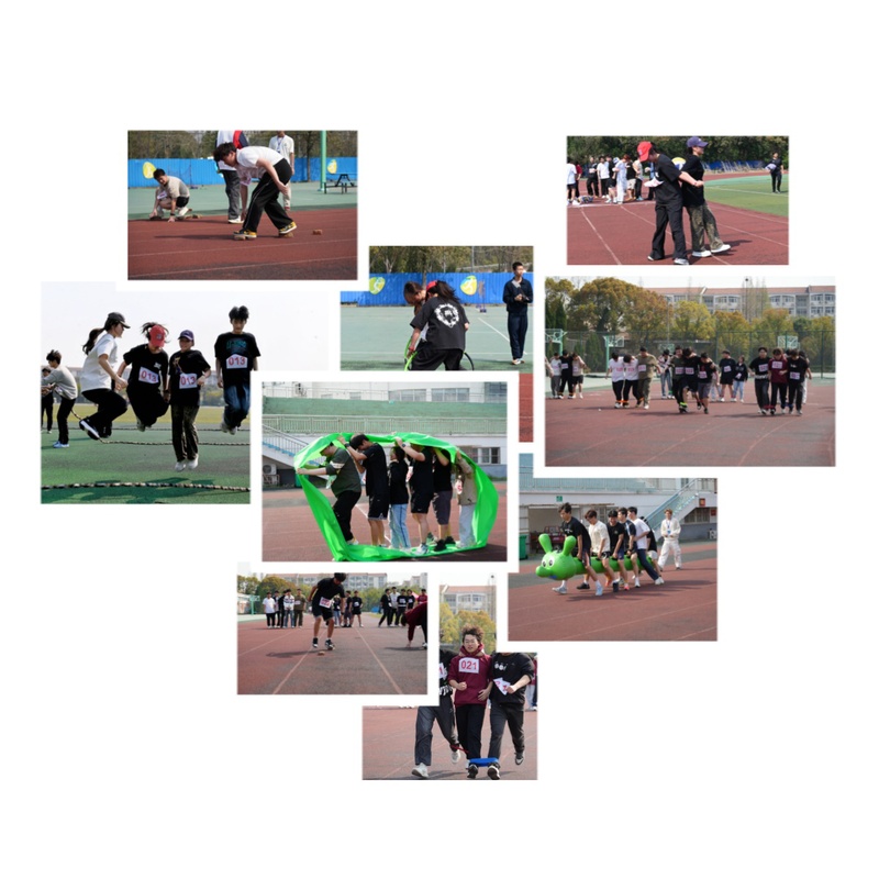 “三人四足”中,队员们绑腿并肩,喊着整齐的口号冲向终点;“螃蟹赛跑”则让选手们化身“横行小分队”,滑稽的步伐引发阵阵笑声;“板砖过河”项目,同学们手脚并用传递过河板砖,稍有不慎便“落水”重来,紧张又欢乐。最热闹的当属“跳大绳”长绳翻飞间,队员们默契起跳,围观同学的计数声一浪高过一浪。“背对背夹球跑”和“无敌风火轮”将合作精神推向高潮。背靠背的选手们小心翼翼护住气排球,时而因速度过快“人球分离”,引得全场捧腹;而“风火轮”项目中,各班队员站在巨型布圈内统一步伐,宛如一条彩色长龙滚滚向前。“毛毛虫竞速”压轴登场,六名队员骑在充气毛毛虫上蹦跳前进,憨态可掬的模样让赛场秒变“大型表情包现场”。